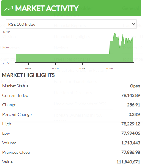 KARACHI: The Pakistan Stock Exchange (PSX) slipped down 741.82 points closing at 77,886.98 points on Wednesday. Thursday (today) morning brought a little respite for the benchmark KSE-100 index posting minor gains after opening.
