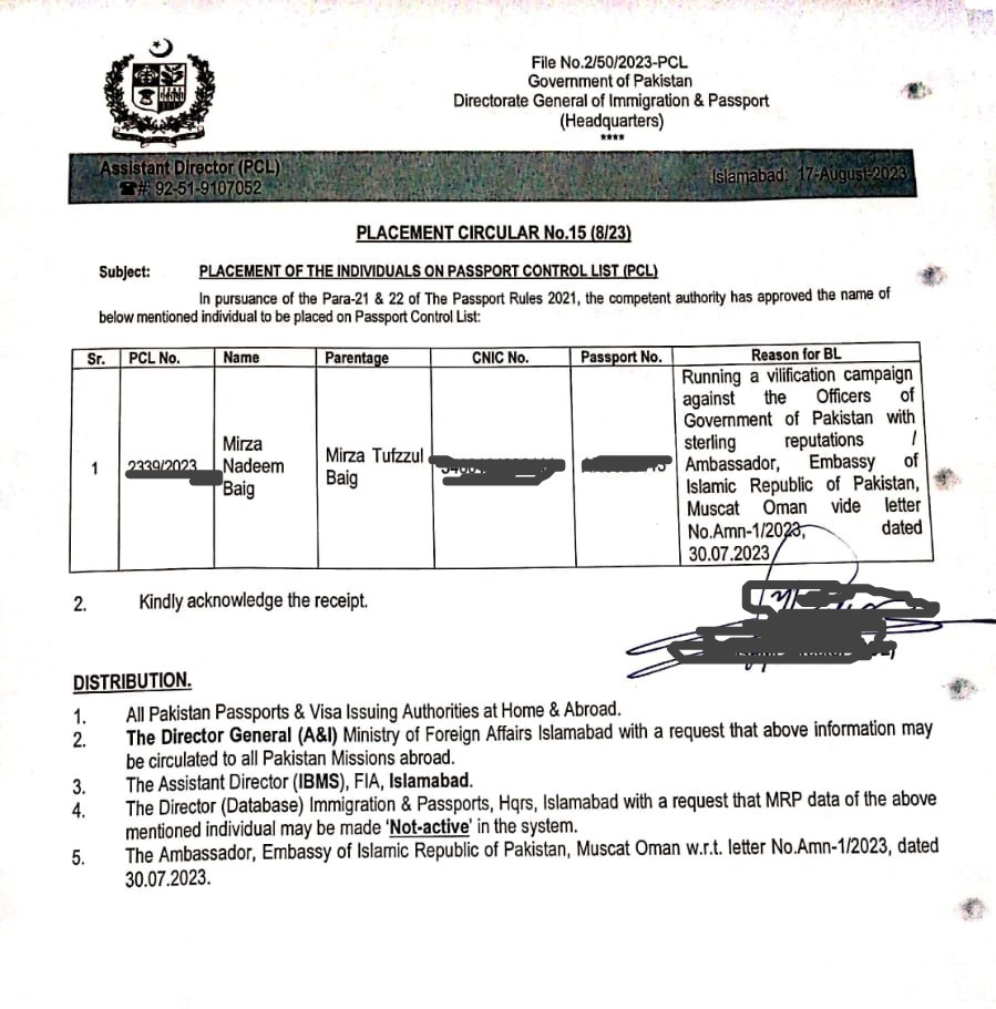 Ali wrote to Director General FIA Mohsin Butt, stating that Mirza Nadeem Baig, the accused who belongs to Daska in District Sialkot, has been blackmailing two ambassadors in tandem with his successor in Barcelona.