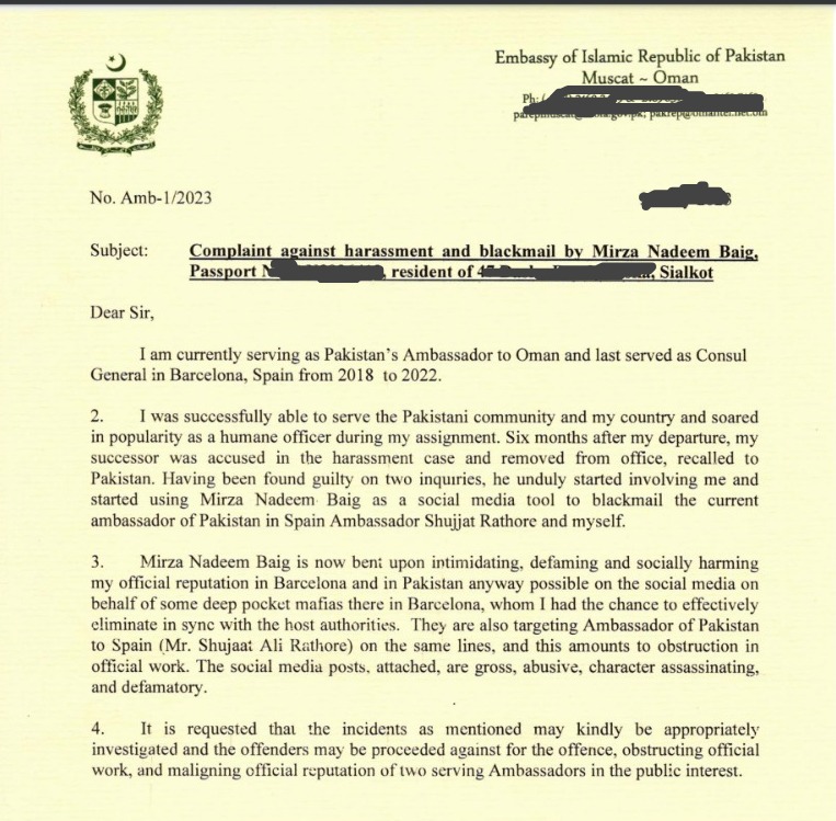 The letter further reads that, “Mirza Nadeem Baig is now determined to intimidate, defame, and harm my official reputation in Barcelona and Pakistan through various means on social media, acting on behalf of influential groups in Barcelona,” and that “they are also targeting the Ambassador of Pakistan to Spain, Mr. Shujaat Ali Rathore, using similar tactics.”