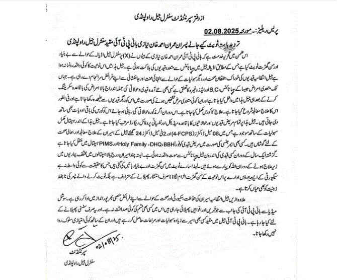 RAWALPINDI: The Rawalpindi Central Jail’s superintendent has said that the sons of Pakistan Tehreek-e-Insaf (PTI) founder and former prime minister Imran Khan shared a baseless and fabricated post on X, claiming that several prisoners had died of hepatitis inside Adiala jail. However, no such incident has occurred, he said.