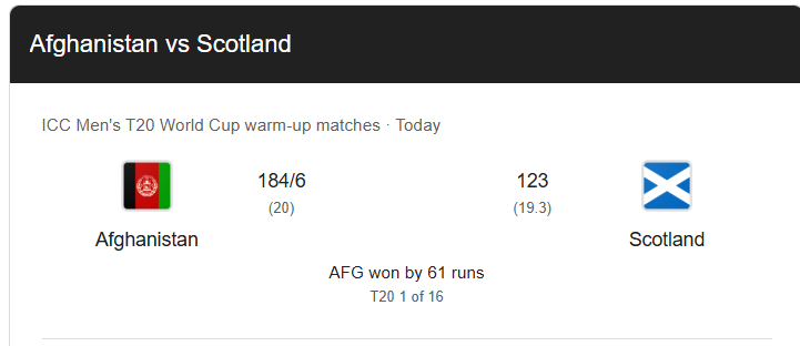 The convincing victory underlined Afghanistan’s growing confidence heading into the tournament, with both batters and bowlers firing in unison. For Scotland, the loss highlighted areas to address ahead of their remaining warm-up fixtures.