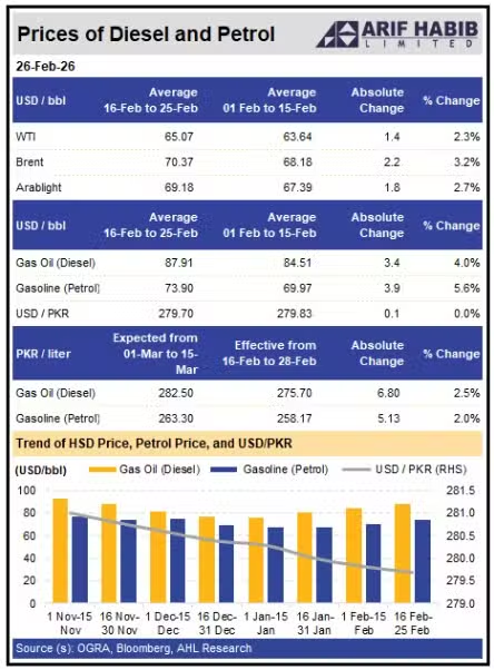 WEB DESK: Petroleum prices are expected to climb in the coming days, with new rates likely to be implemented from 1 March 2026, subject to government approval. Estimates suggest an increase of up to Rs6.8 per litre, according to projections shared by Arif Habib Limited.