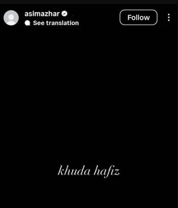 Pakistani pop sensation Asim Azhar has stirred curiosity among fans after suddenly removing all posts and photos from his Instagram account. The unexpected move followed a brief Instagram Story in which the singer wrote, “Khuda Hafiz”, leaving followers wondering what prompted the emotional message.