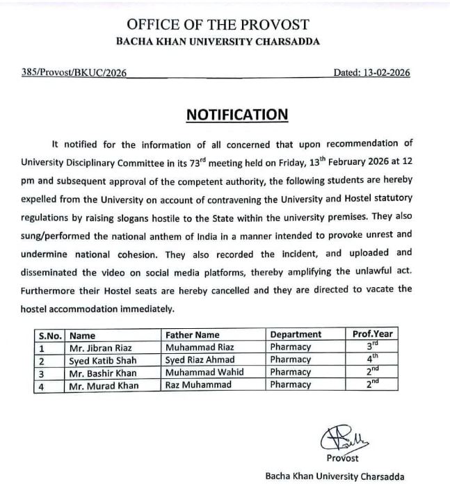 The notification stated that the students violated university and hostel regulations by raising anti-state slogans within campus premises and deliberately attempting to provoke unrest and undermine national unity.