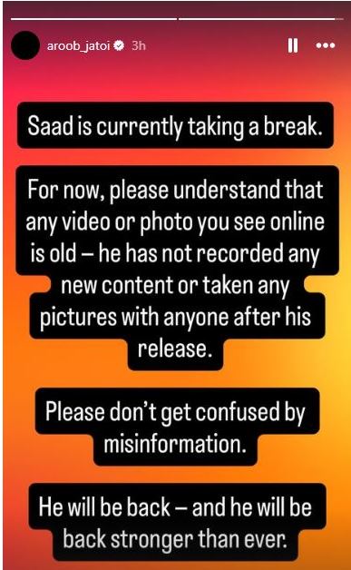“Saad is currently taking a break. He has not created any new content after his release. Any video or photo currently circulating is old,” she stated.