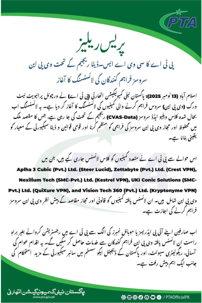 PTA has already begun issuing licenses to VPN service providers, and several companies have successfully obtained approval under the new framework. According to the regulator, these licensed VPNs have undergone a rigorous vetting process, including background checks, security audits, and infrastructure verification. PTA officials say this ensures that approved services are free from the cybersecurity risks associated with free or unregistered VPNs.