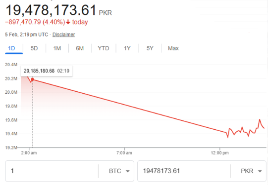 ISLAMABAD: The price of Bitcoin in Pakistan experienced a sharp drop of more than 4 per cent against the Pakistani rupee, as the virtual currency was valued at Rs19,432,722, down from its previous price of Rs20,418,923. This sudden decline has left both crypto investors and analysts questioning the cause behind such a steep drop.