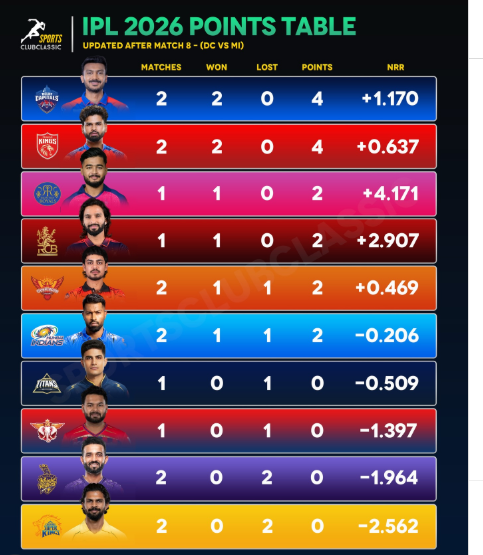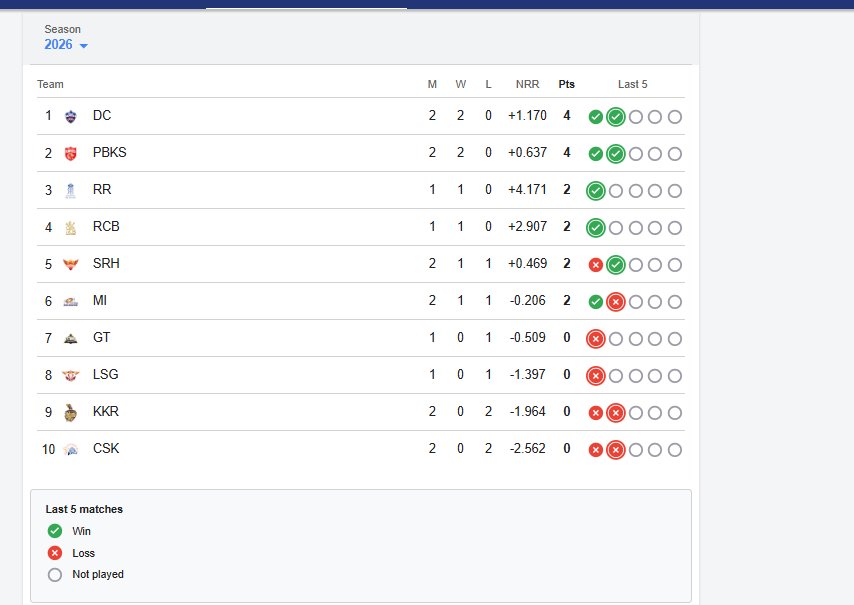 Currently, the Delhi Capitals lead the 2026 IPL with 2 wins from 2 matches, totaling 4 points and a net run rate of +1.170, with Punjab Kings close behind. PNK are standing unbeaten with 2 wins and 4 points in the so far IPL standings, but with a lower NRR of +0.637. Rajasthan Royals and RCB have won their opening games, sitting on 2 points each, with impressive net run rates of +4.171 and +2.907 respectively.