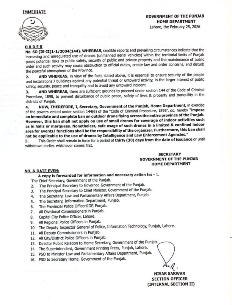 According to an official notification issued by the Punjab Home Department, the restriction takes immediate effect and will remain in place for 30 days. The order prohibits the flying of all outdoor drones, with authorities citing the need to prevent potential security threats and ensure public safety.