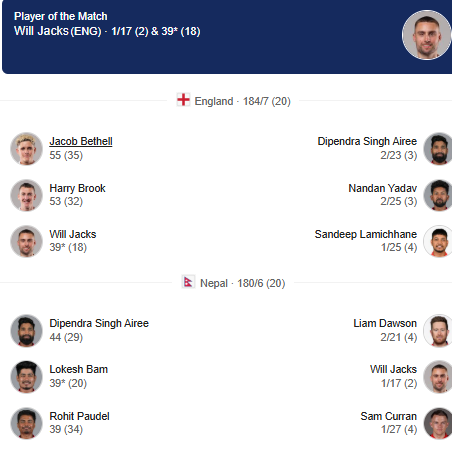 The result highlighted England’s depth in both batting and bowling, while Nepal’s spirited performance underscored their growing competitiveness on the world stage. The narrow win ensures England remain in strong contention in the early stages of the tournament, while Nepal can take pride in pushing a former champion to the edge.