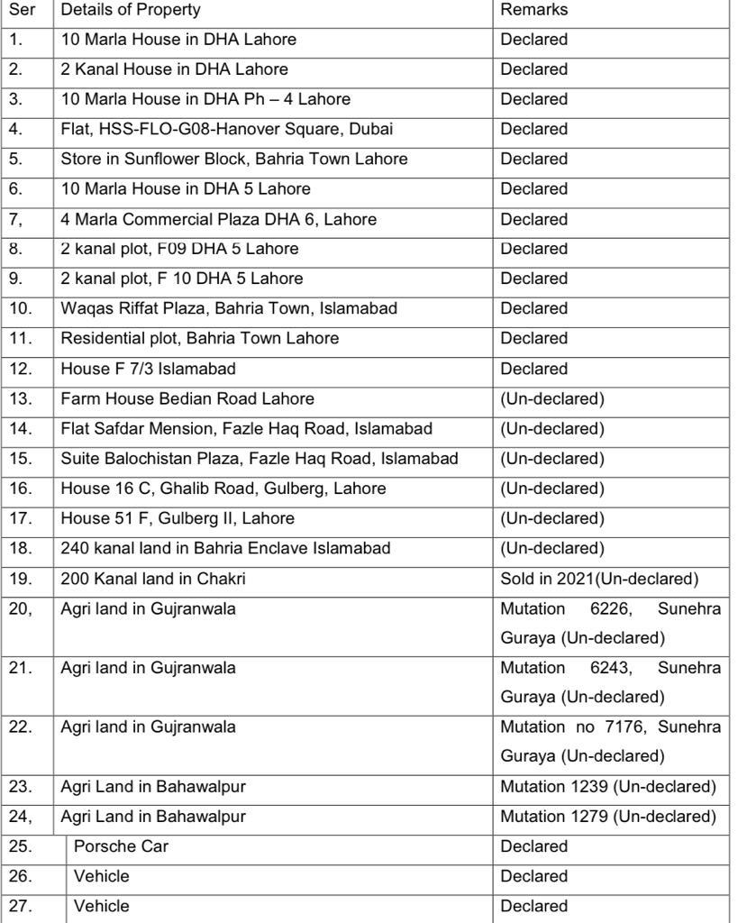 Farah Gogi’s agricultural land in Bahawalpur and Gujranwala, residential and commercial properties in Islamabad and Lahore, and 200 kanal agricultural land in Chakri are owned but undisclosed by her.