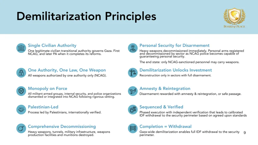 Oversight of disarmament would fall to a new technocratic committee composed of Palestinian appointees. The plan calls for the destruction of heavy weapons, tunnels and military infrastructure, but stops short of detailing who would carry this out or under what authority. Hamas has previously said it would only relinquish arms to a sovereign Palestinian state, complicating the proposal.