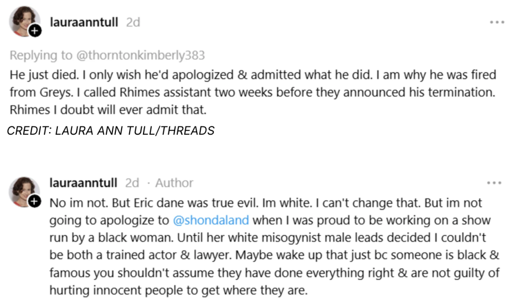 Tull also suggested she influenced Dane’s departure from the long-running ABC series, writing, “I am why he was fired from Grey’s”, and claiming she had contacted production before his exit. She did not provide evidence to support that assertion.