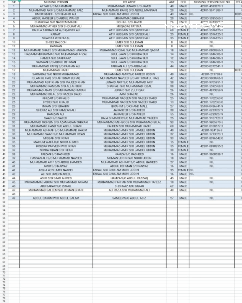 Additional missing persons include Muhammad Mohsin, Muhammad Hanif, Muhammad Ashraf, Muhammad Saad, Misbah, Faizan, Hasan Ali, Muhammad Arif, Aamir, and Ayesha, as well as Asim, Muhammad Abrar, Muhammad Saleem, and Abdul Qayyum.