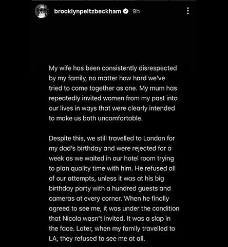 According to an insider cited by US media, the turning point came last week, shortly before the 26-year-old released a public statement addressing the family rift. The source said the situation had deteriorated to the extent that Brooklyn and his wife, actress Nicola Peltz Beckham, no longer felt they could rely on his parents in private or public matters.