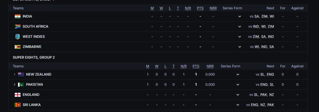 Under Super Eight rules, a win earns two points, while a tie or no result gives each team one point. With net run rate looming as a potential tiebreaker, every match carries high stakes.