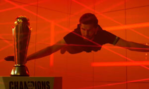 The video opens with Shaheen Afridi hanging from a rope held by Shadab Khan, as he dives into a heavily guarded locker to secure the coveted Champions Trophy.