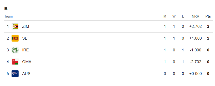 Zimbabwe has made a dominating start, boasting a net run rate of +2.702 and sitting at the top of Group B. Sri Lanka follows closely with 2 points, keeping their hopes alive. Ireland and Oman have struggled in their early games, while Australia is yet to take the field, leaving fans eager to see how the defending champions perform.