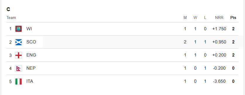 The West Indies have made a statement with a strong win, topping Group C with a net run rate of +1.750. Scotland and England have also collected points, keeping the group competitive, while Nepal and Italy need to find form to stay in the running.