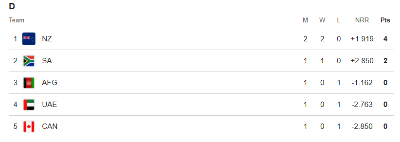 New Zealand is asserting dominance with two wins from two matches, leading the group with 4 points and a net run rate of +1.919. South Africa is close behind with 2 points and an impressive +2.850 net run rate. Afghanistan, the UAE, and Canada are yet to make a significant impact.