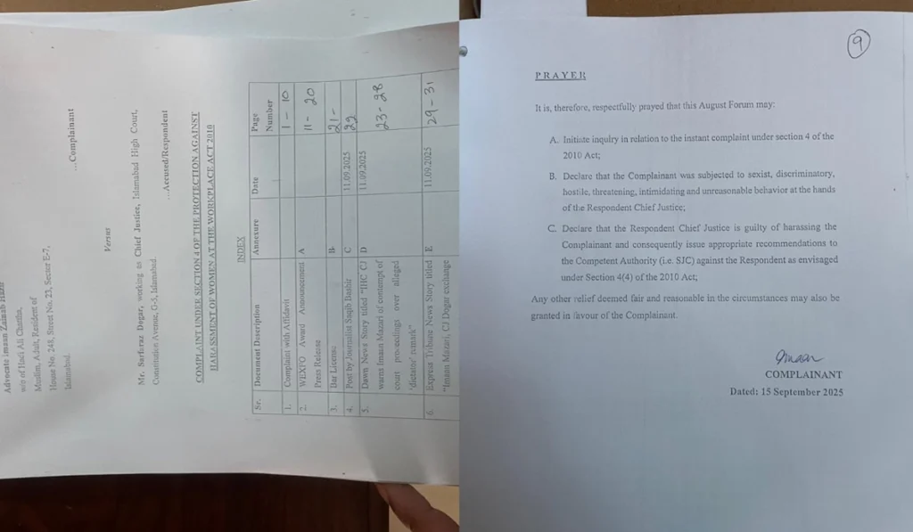 The complaint further requested that “the chief justice be held guilty of harassment” and that the matter be referred to the Supreme Judicial Council (SJC). Mazari also shared her application on the social media platform X.