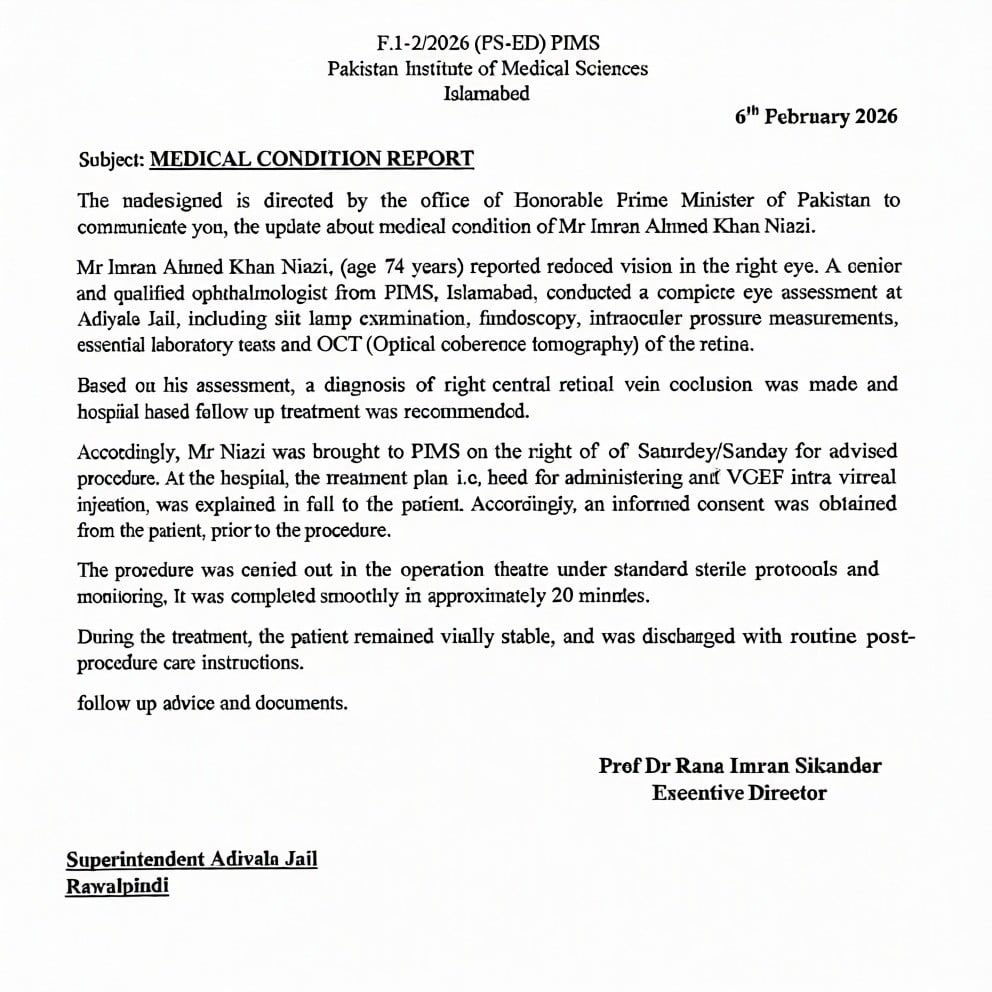 The report added that while Khan’s overall health condition was satisfactory, medical specialists confirmed that vision in his right eye had been affected due to the diagnosed condition.