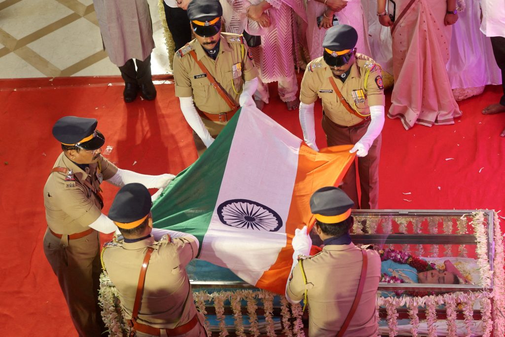 The tribute took place at her residence in Lower Parel, where family members, close friends and admirers gathered to honour her legacy. According to Gulf News, Soldiers were seen formally draping her casket in the national flag, which was adorned with white lilies, symbolising respect and remembrance.