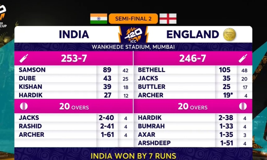 Sanju Samson led India’s charge with a sensational 89 off 42 balls, featuring eight fours and seven sixes, as the team posted a massive total of 253 for 7 in 20 overs against England in the IND vs ENG semi-final.