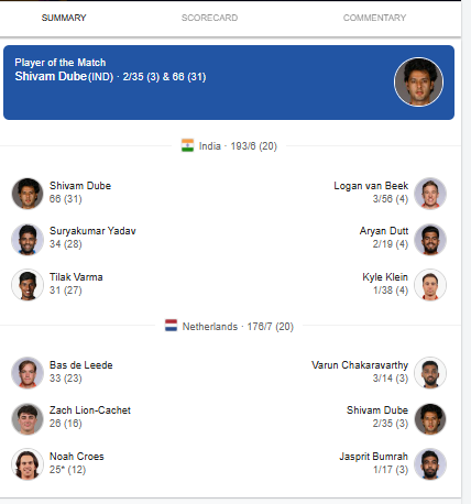 A thrilling encounter at the ICC Men’s T20 World Cup saw all-rounder Shivam Dube as the top performer, earning Player of the Match after contributing 66 off 31 in batting and taking 2 for 31 while defending the team’s 193-run total in IND VS NL tonight.
