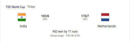 India showcased their dominance by posting 193-6 in 20 overs against the Netherlands, eventually winning the match by 17 runs in a high-octane Group Stage clash.