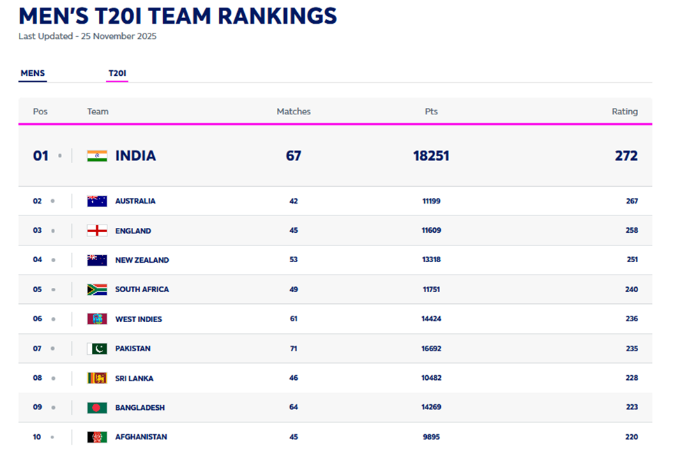 The newly released ICC Men’s T20I Team Rankings shows shows the India’s consistent performances have kept them ahead of Australia, who sit 2nd with 267 rating points.