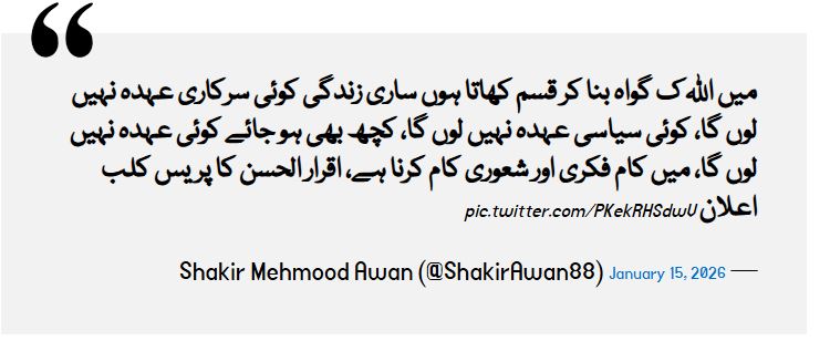 He made the announcement at a press conference at the Lahore Press Club, where Iqrar Ul Hassan emphasided that he will never hold any political party position or government office.