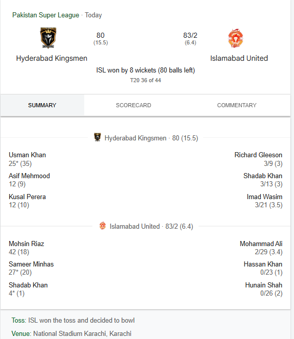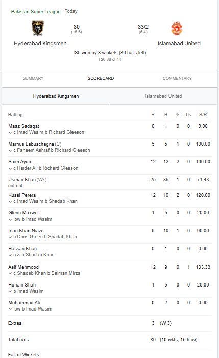Earlier, Islamabad United’s bowlers had set up the victory by dismantling the Kingsmen for just 80 runs in 15.5 overs. Richard Gleeson, Imad Wasim, and Shadab Khan led the attack with three wickets each, while Salman Mirza added one.