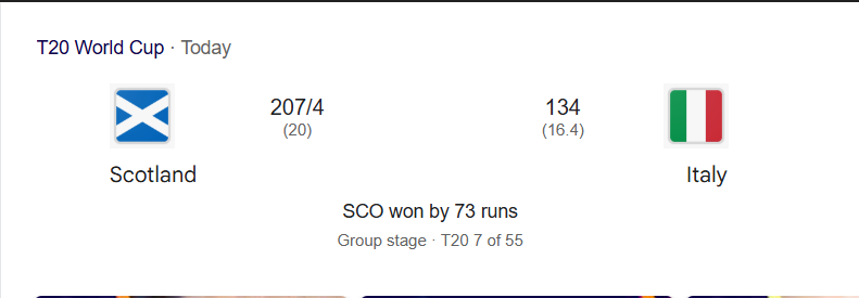 KOLKATA: Scotland defeated Italy by 73 runs in the ITL VS SCO clash on Friday, as the seventh match of the ICC T20 World Cup witnessed a dominant all-round performance from the Scottish side.