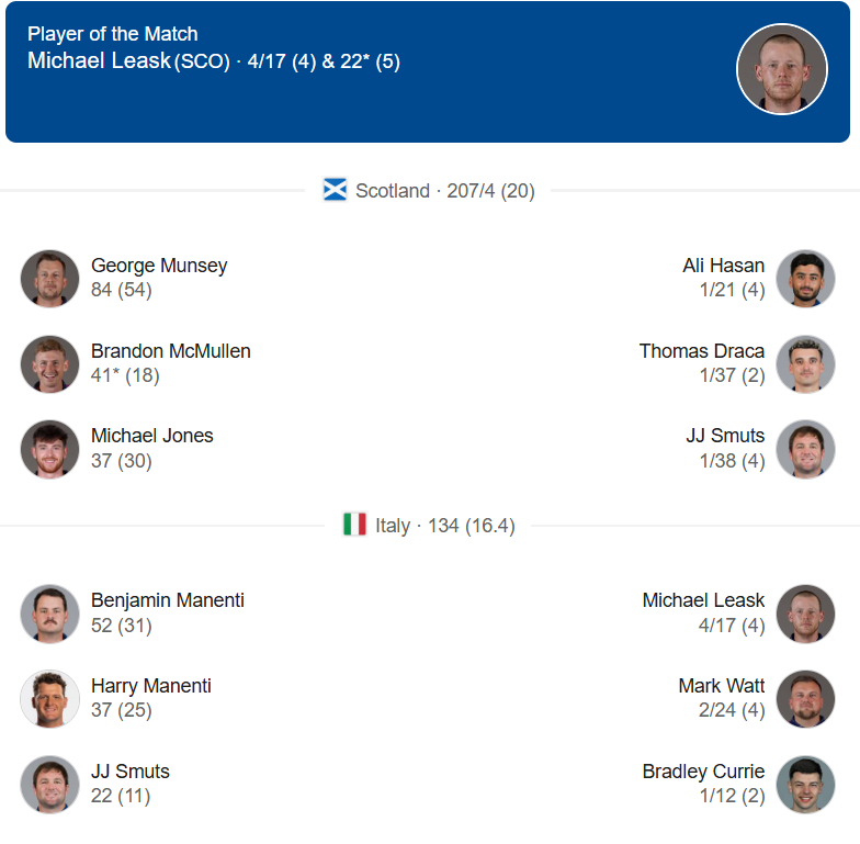 Michael Leask was named Player of the Match as the ITL VS SCO encounter came to an end. The match began with Italy winning the toss and opting to field first.