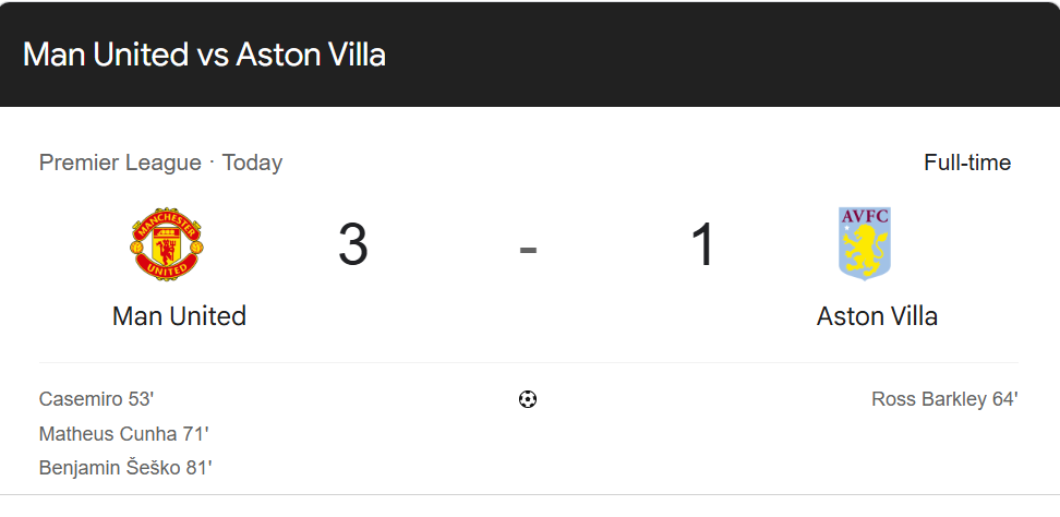 MANCHESTER: Manchester United vs Aston Villa ended in a 3-1 victory for the hosts as the Red Devils tightened their grip on third place in the Premier League.