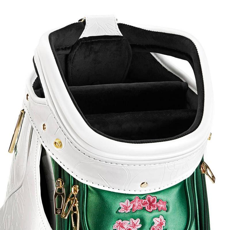 The centerpiece staff bag ($699.99) will be used by top pros like Rory McIlroy, Scottie Scheffler, and Collin Morikawa, featuring gold hardware, azalea embroidery, a detachable “26” patch, and other nods to Augusta traditions.