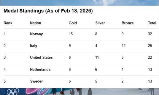 MILAN: The 2026 Winter Olympics entered its decisive final week on Wednesday, February 18, 2026, with Norway tightening its grip on the top of the medal table while the hosts Italy continue a record-breaking performance on the Rome’s soil.