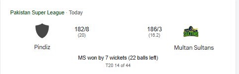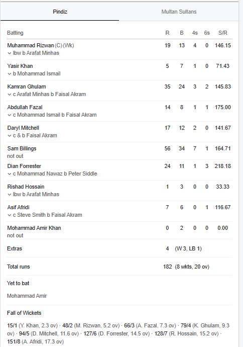 Earlier, Sam Billings’ unbeaten half-century helped Pindiz post a fighting total of 182-8 against Multan Sultans in the 14th match of the PSL-11.