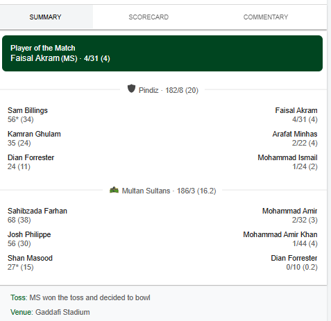Despite the strong batting effort, Faisal Akram spearheaded Multan Sultans’ bowling attack with a four-wicket haul for 31 runs in four overs.