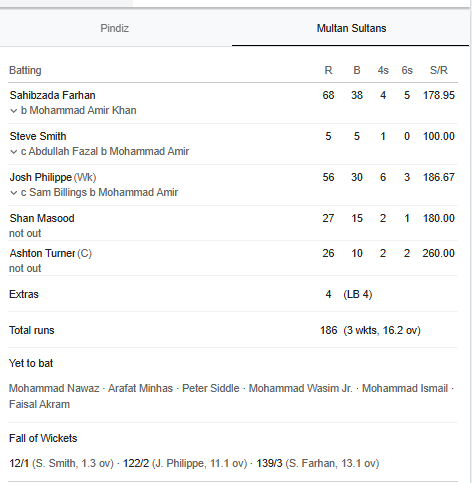 Following their departures, skipper Ashton Turner and deputy Shan Masood guided the Sultans home with a calm 47-run unbeaten partnership. Masood finished on 27 off 15 balls, while Turner remained not out on 26 from just 10 deliveries.