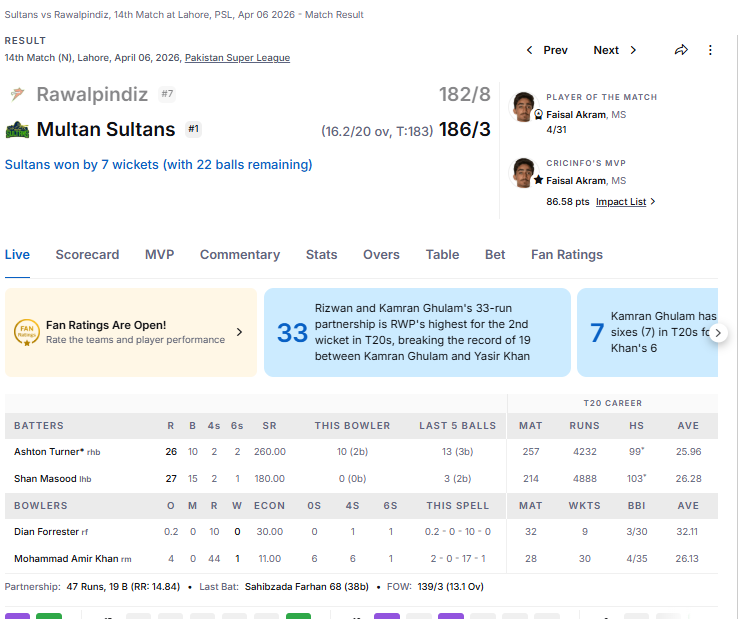 Multan Sultans secured a commanding seven-wicket win over RawalPindiz in the 14th match of the Pakistan Super League (PSL) 11 at Gaddafi Stadium, powered by blistering half-centuries from Sahibzada Farhan and Josh Philippe.