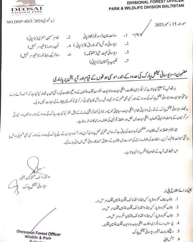 WEB DESK: In a decisive move to protect one of Pakistan’s most fragile high-altitude ecosystems, the Gilgit-Baltistan (G-B) government has imposed a complete ban on all seasonal hotels, camps, and luxury “glamping” facilities within Deosai National Park. The order, issued by the Forest, Parks and Wildlife Department, aims to halt environmental degradation and shield wildlife from escalating tourism pressure.