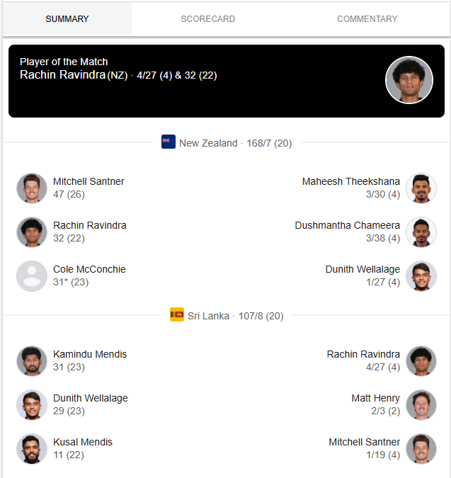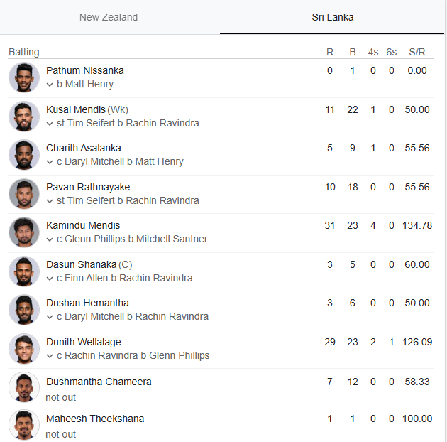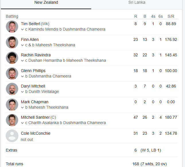 However, Sri Lanka failed to chase 168, though backed by both their batting depth and experience in Colombo conditions, but had a bad day to chase the total. All of them were out in the last over at 107, with Kamindu Mendis and Dunith Wellalage remaining the only top batters. Mendis scored 31 while Wellalage managed only 29. The rest, the pitch appeared good for batting, but only in favour of the NZ side, as they looked to hunt the SL all down well beforehand.