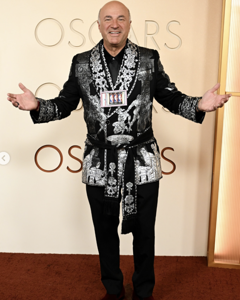 Kevin O’Leary opted for a dramatic Dolce & Gabbana jacket paired with black trousers and a matching shirt.