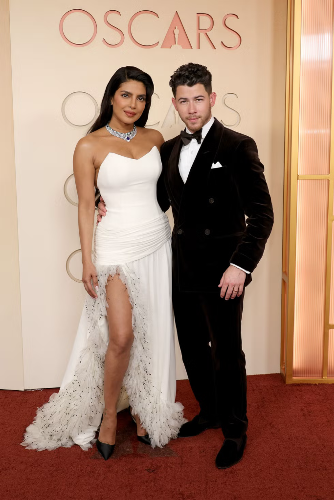 Priyanka Chopra Jonas arrived in a white Dior gown featuring a strapless bodice and thigh-high slit.