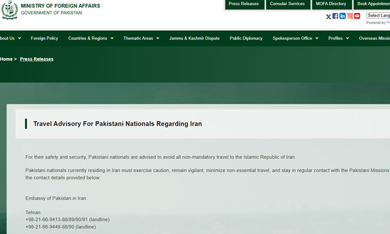 Pakistan advises citizens to avoid travel to Iran amid Middle East escalation
