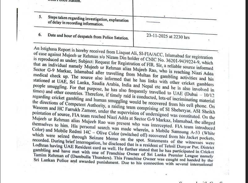 According to the FIR, the first accused, Mujeeb ur Rehman alias Mujeeb Rao, was intercepted at Niazi Adda in Sector G-9, Islamabad, after arriving from Multan for what investigators believe were gambling-related activities.