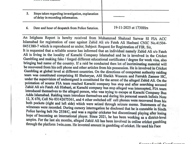 The FIR stated that he introduced himself as a professional Pakistani umpire, gathered WhatsApp contacts, created a group titled “World Cricket Law”, and used it to build connections internationally for gambling and suspected money laundering.