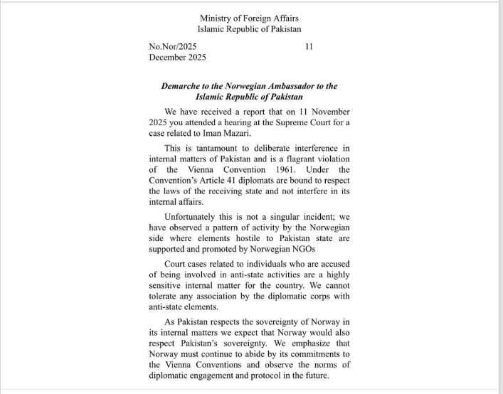 ISLAMABAD: Pakistan has issued a strong demarche to the Norwegian ambassador for attending a Supreme Court hearing in the case of human rights activist and lawyer Imaan Mazari and her husband Hadi Ali, describing the act as deliberate interference in Pakistan’s internal affairs.
